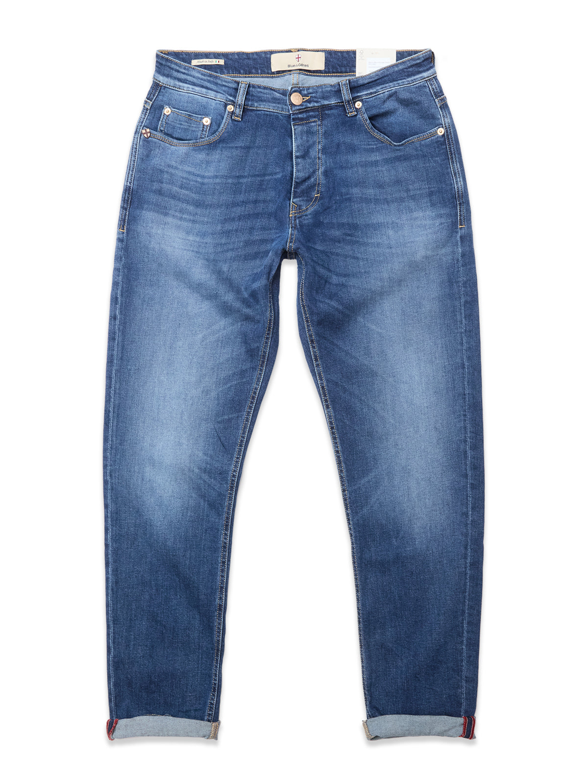 Deze klassieke five-pocket jeans heeft een relaxte regular fit met taps toelopende pijpen en combineert comfort met een modern silhouet. De Recco Jeans onderscheidt zich door de unieke boogvormige achterzakken, die blauwe oceaangolven voorstellen, en de opvallende stiksels op de gulp en het muntzakje, geaccentueerd door contrasterend garen.