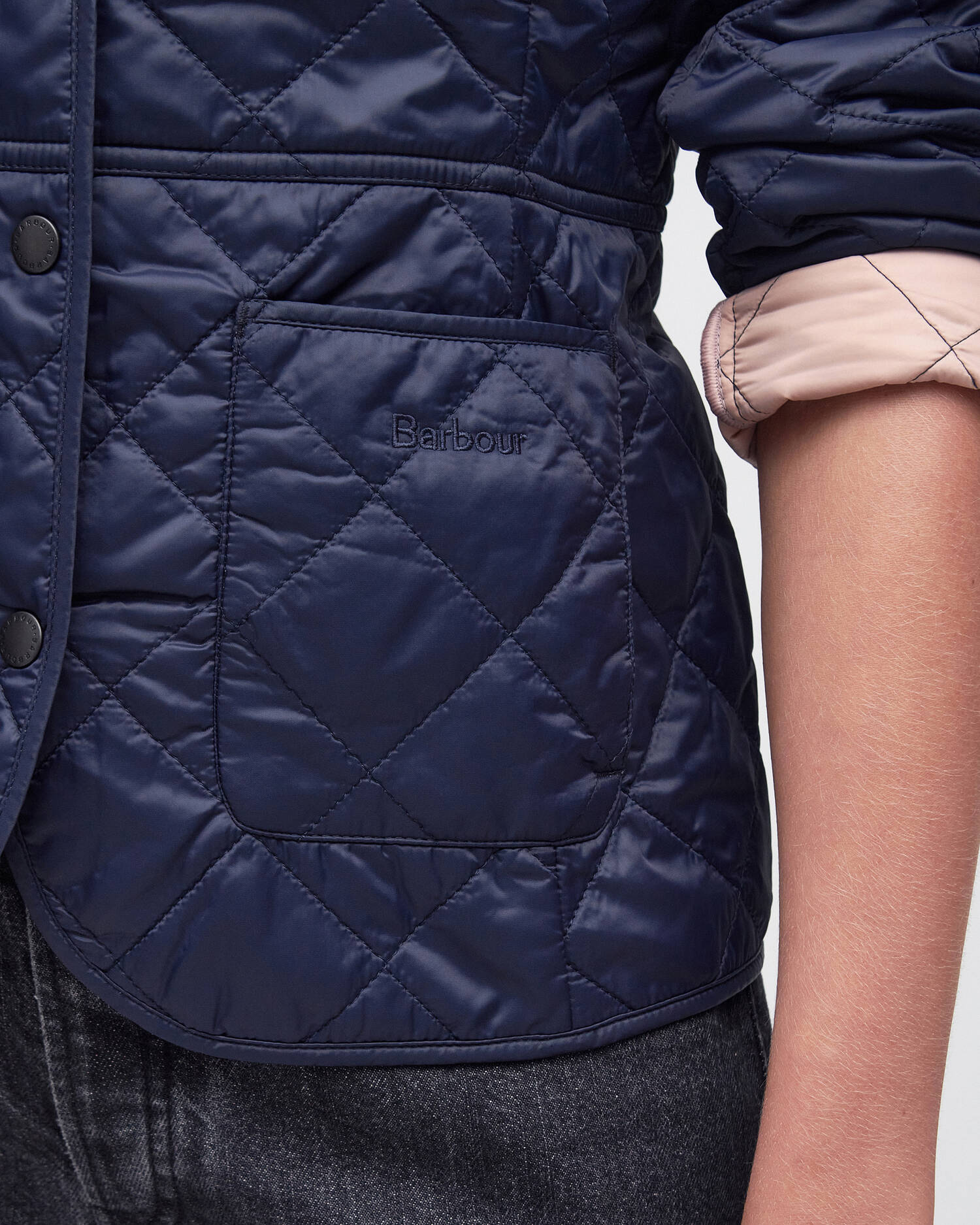 De Barbour Deveron jas is doorgestikt met een corduroy kraag en een vrouwelijke, contrasterende voering. Hij heeft twee praktische opgestikte zakken aan de voorkant en geborduurde Barbour-merkdetails voor een authentieke uitstraling.