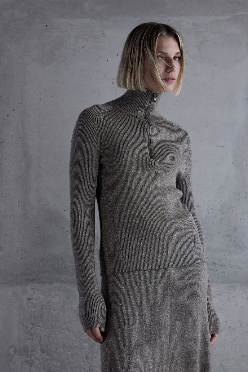 Een gebreide pullover met een lichte lurex draad en een ritssluiting. Combineer deze fijne trui met de bijpassende rok Stella voor een mooie co-ord set.