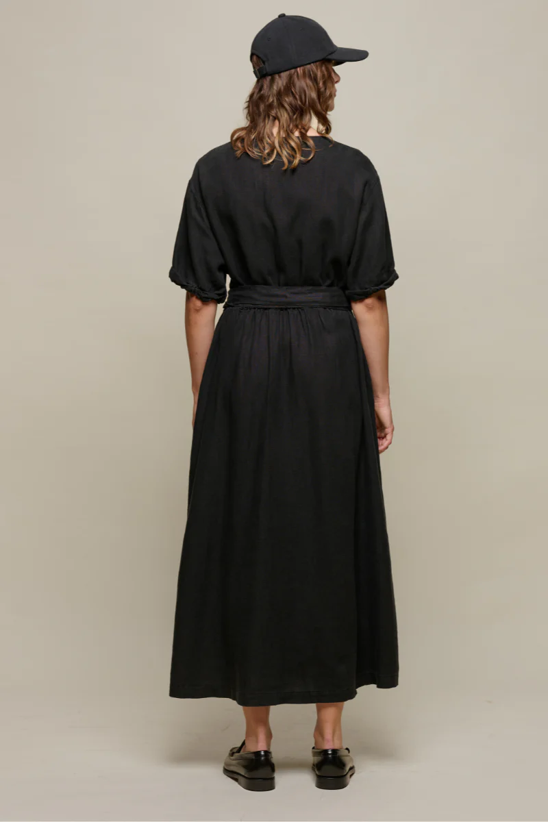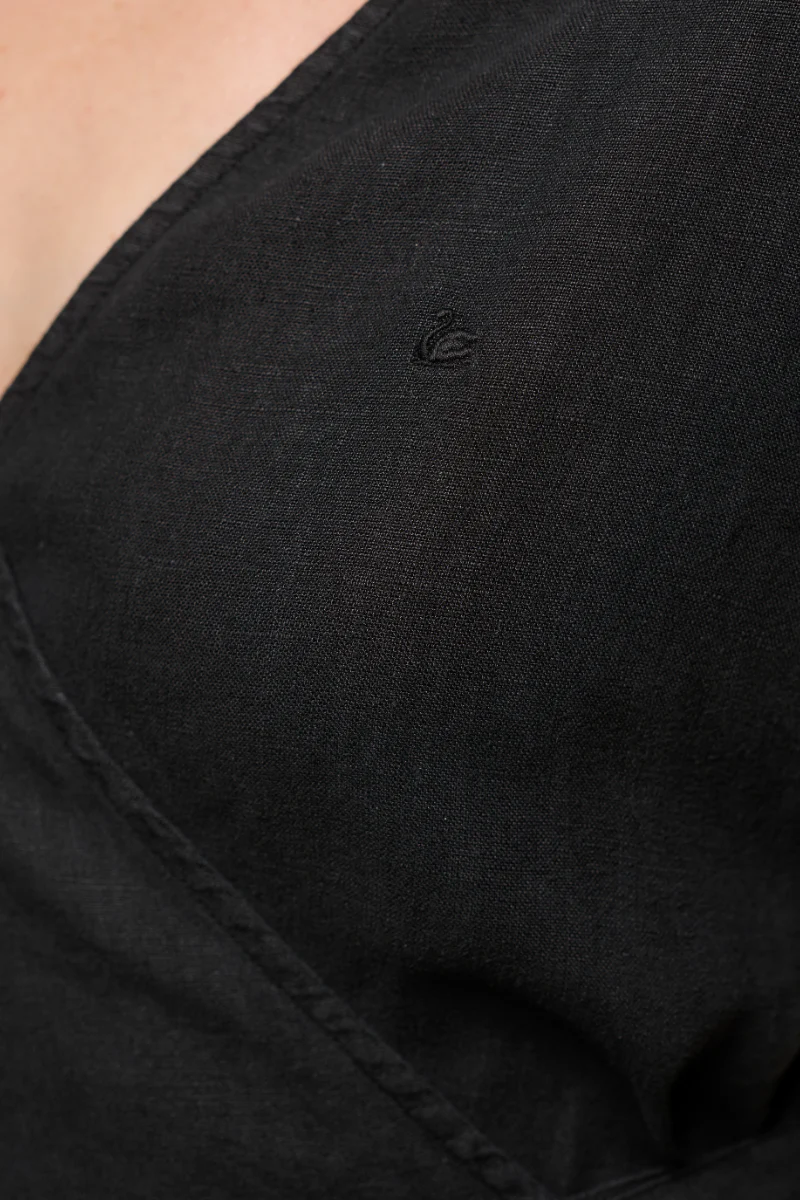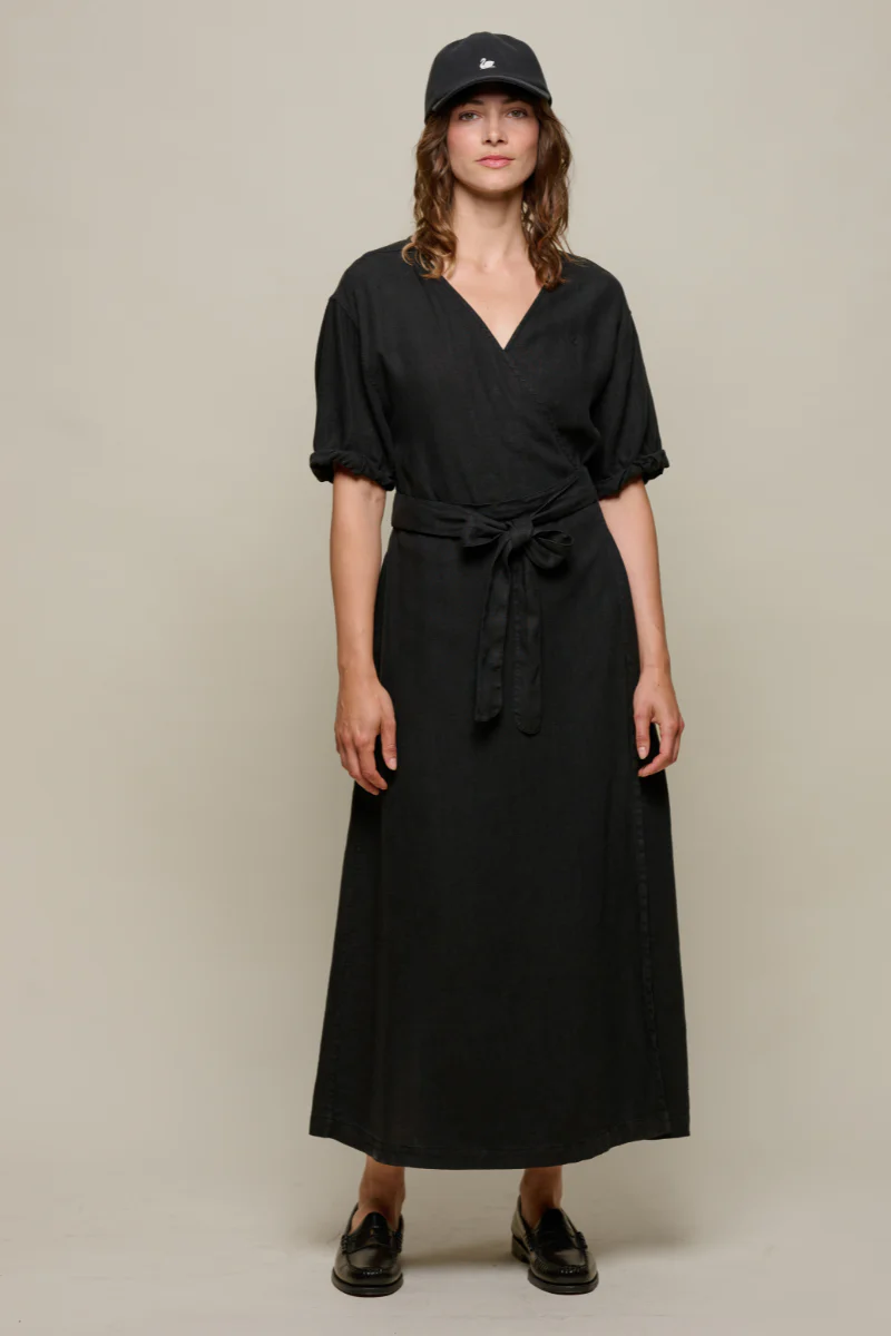 Een casual elegante wikkeljurk die perfect is voor zowel alledaags als chiquer gebruik. De lichte linnen stof valt prachtig en is ademend op warme dagen, terwijl de wikkelstijl en de tailleband de pasvorm accentueren. Korte mouwen maken de relaxte en stijlvolle look compleet.