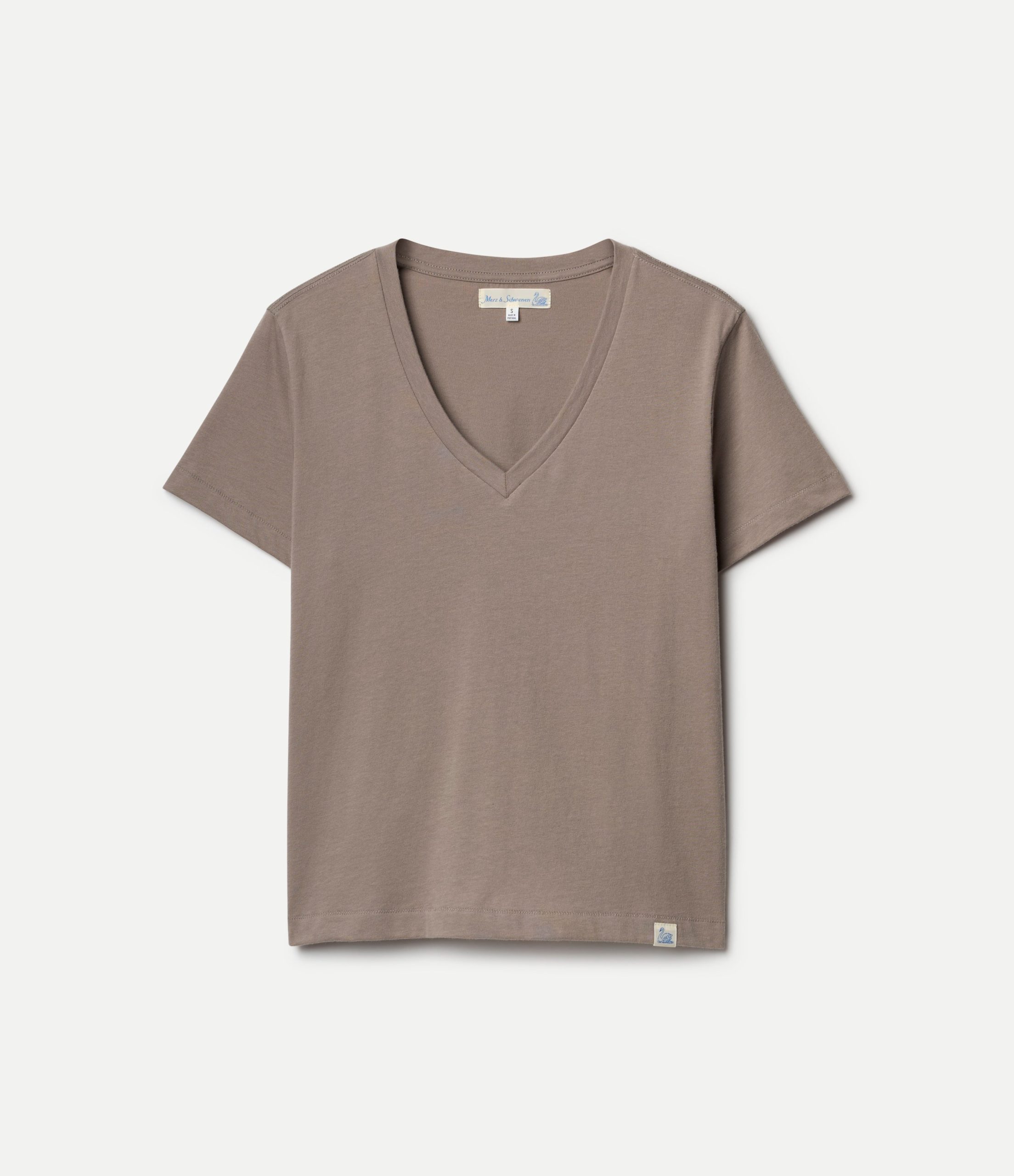 Het T-shirt heeft een V-hals met panelen, driehoekige inzetstukken onder de armen en baseballstiksels op de zoom en mouwen. Een lusvormig label met zwanenmotief geeft dit comfortabele T-shirt een subtiele finishing touch.